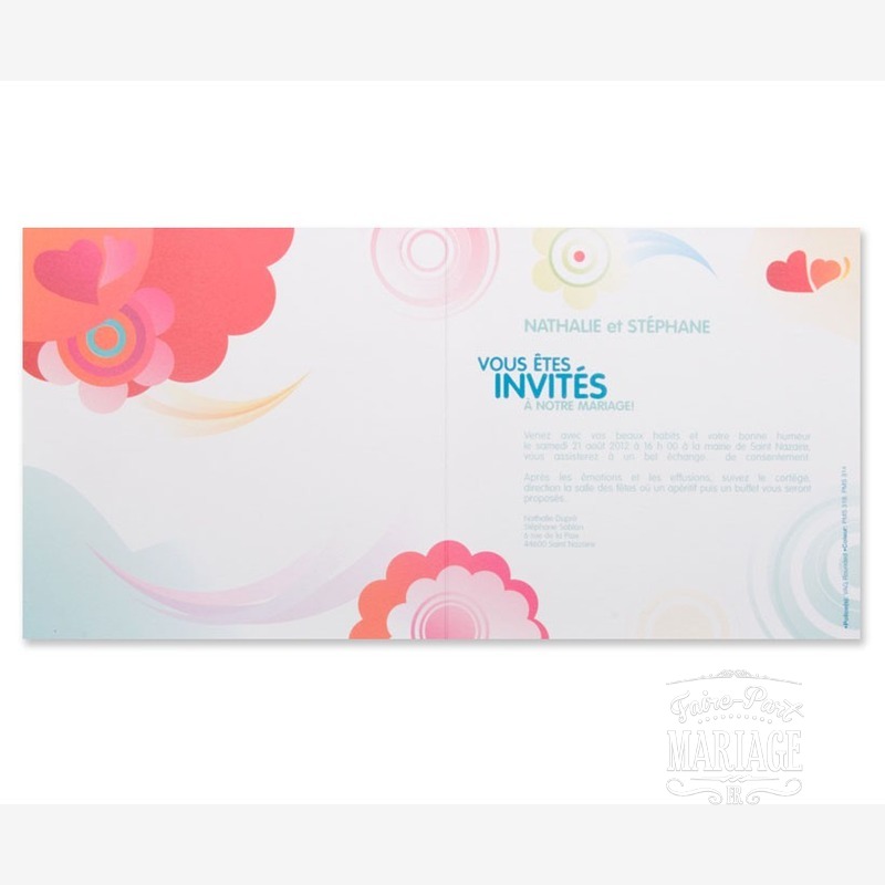 frais et coloré, le faire-part-mariage pop art en multicouleurs et impression des motifs sur la couverture comme sur l'intérieur.